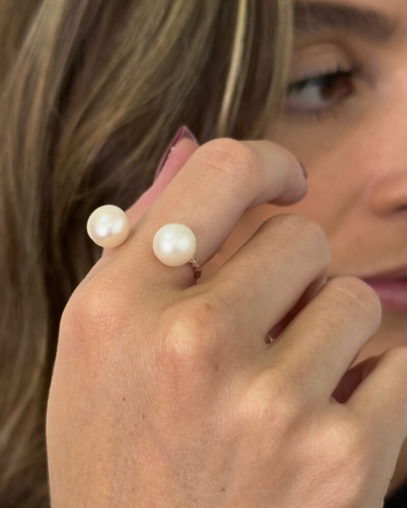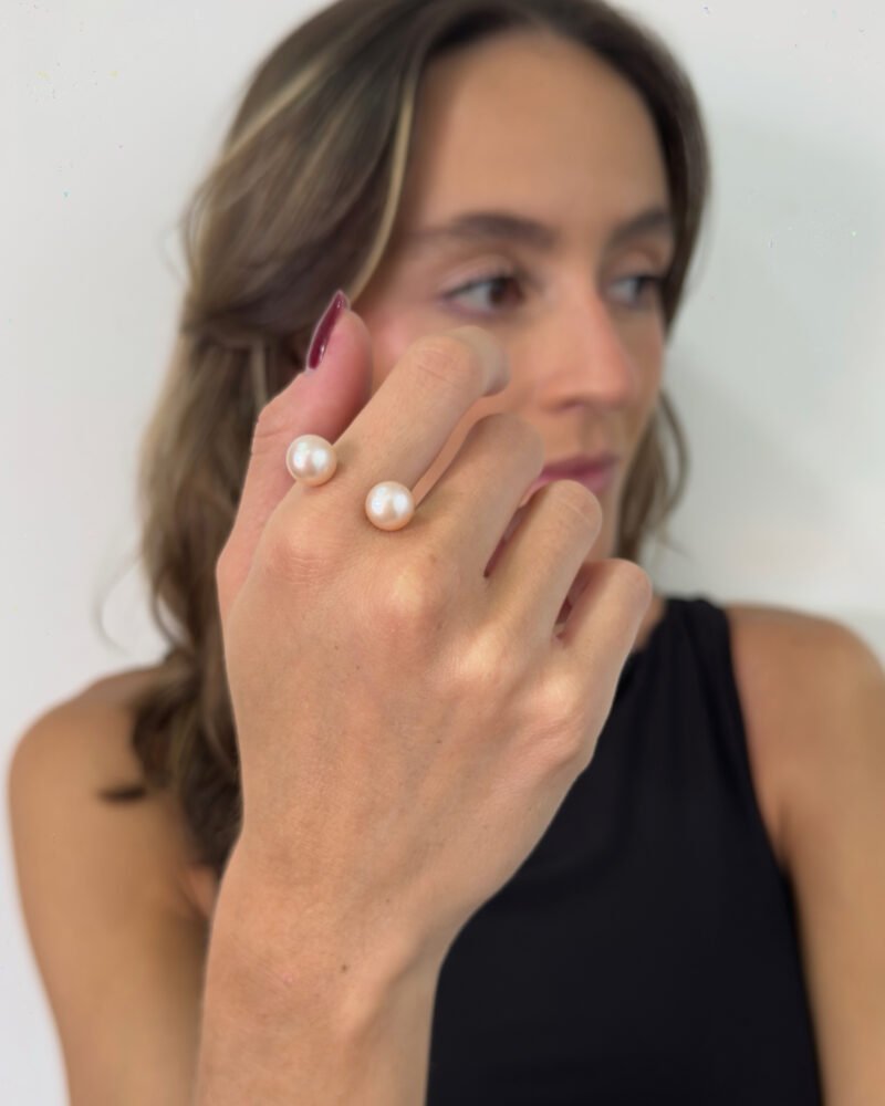 Anillo de base en plata con dos perlas cultivadas peach que crean un diseño elegante y equilibrado. Una pieza delicada que combina lo clásico con un toque moderno, perfecta para destacar con sutileza.