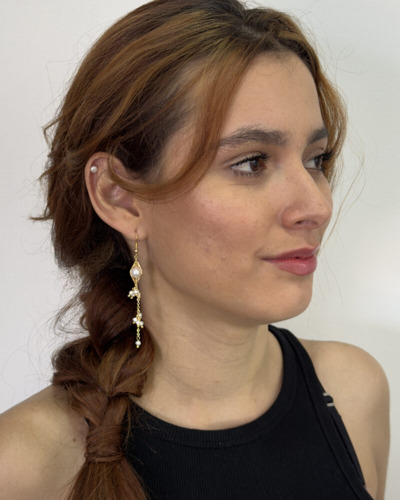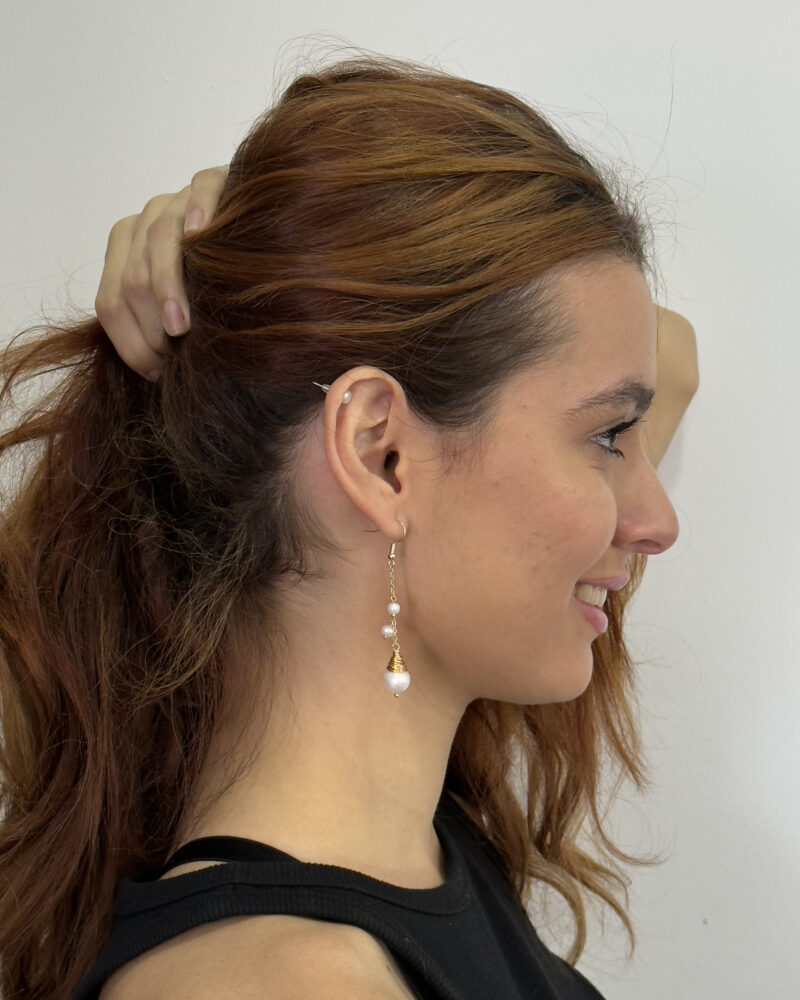 Un diseño actual con esencia clásica: aretes dorados adornados con perlas cultivadas que evocan frescura y sofisticación. Una pieza que trasciende tendencias y se convierte en ese básico moderno capaz de acompañar cualquier momento con estilo.