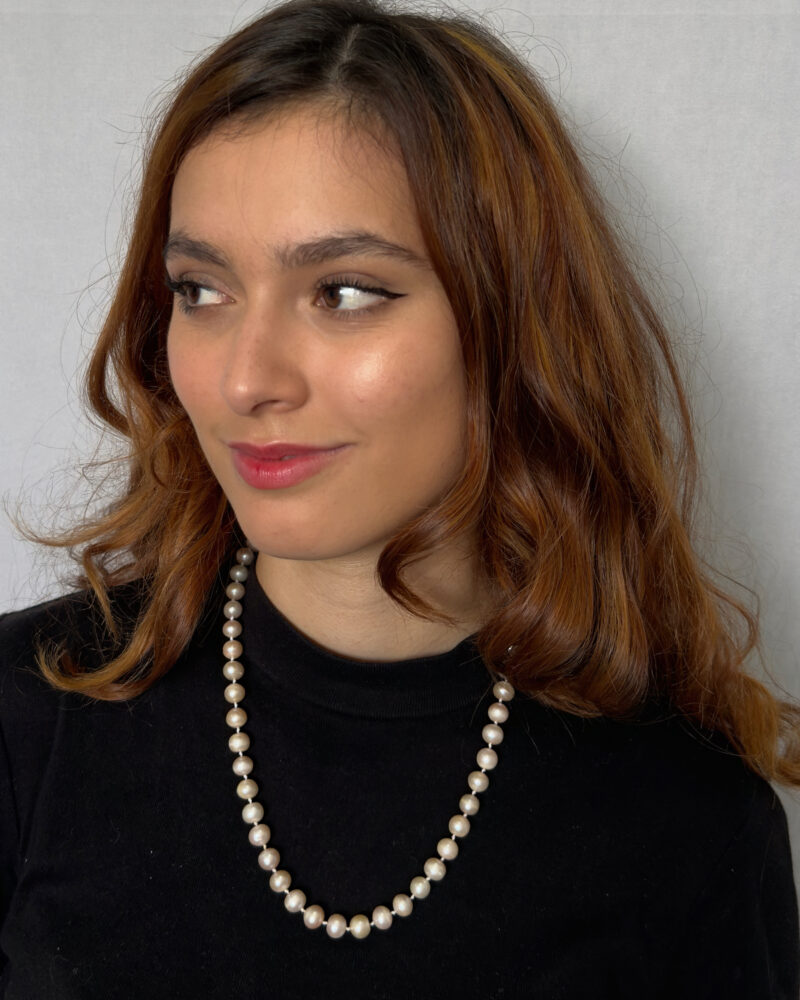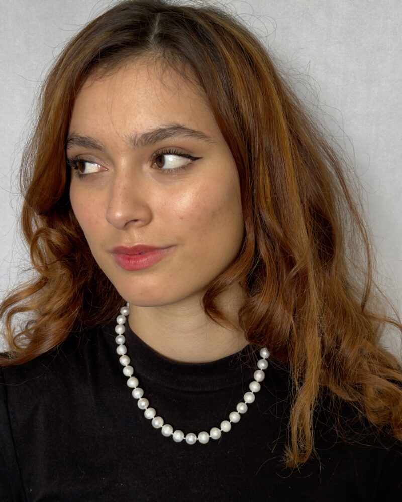 Un collar anudado con perlas blancas de 10mm es lo que podríamos llamar un »ícono de la joyería». Por su estructura, trasciende el tiempo, es la esencia de la elegancia.