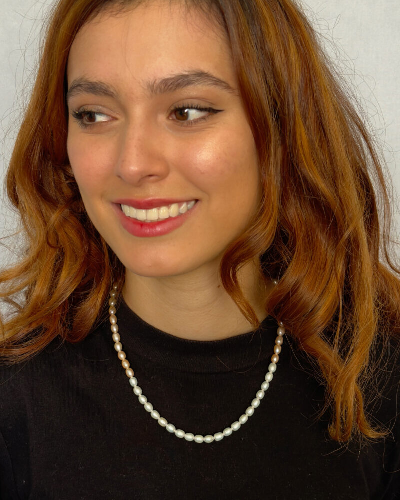 Este collar combinado con perlas oval de 5×7 mm blancas, rosadas y peach es la combinación perfecta para resaltar un look casual