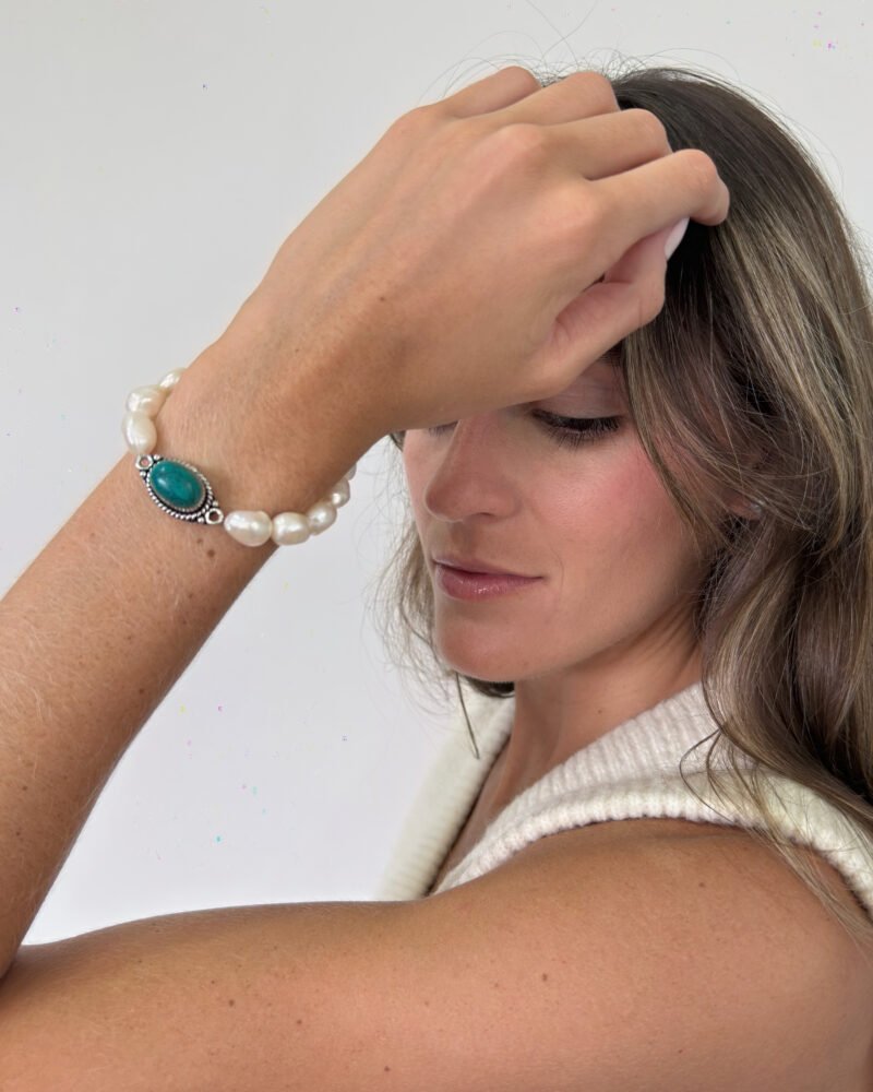 Esta pulsera resalta por su piedra turquesa central, un tono vibrante que aporta frescura, luz y personalidad a la pieza. En contraste con las perlas cultivadas, crea una combinación armoniosa entre lo clásico y lo llamativo, logrando un diseño equilibrado. Perfecta para quienes buscan un toque de color elegante que no pase desapercibido.