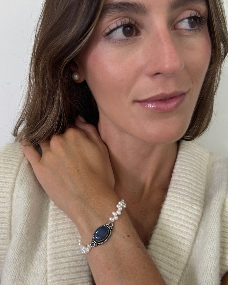 Esta pulsera destaca por su piedra central de apariencia orgánica, con vetas que reflejan la esencial de lo natural. Combinada con perlas cultivadas logra un equilibrio perfecto entre lo delicado y lo auténtico, creando una pieza con carácter sutil pero distinto. Ideal para quienes conectan con lo imperfectamente perfecto.
