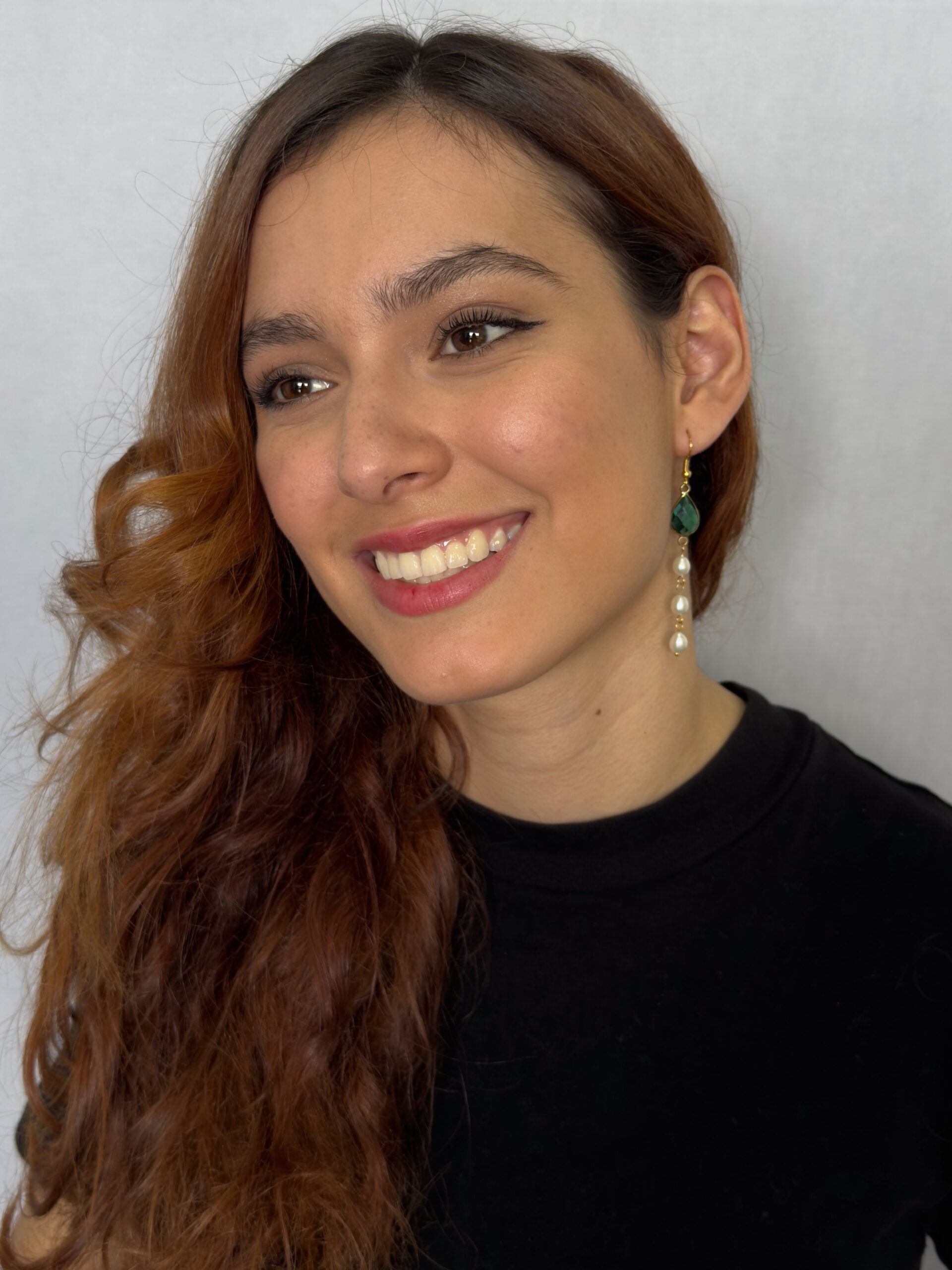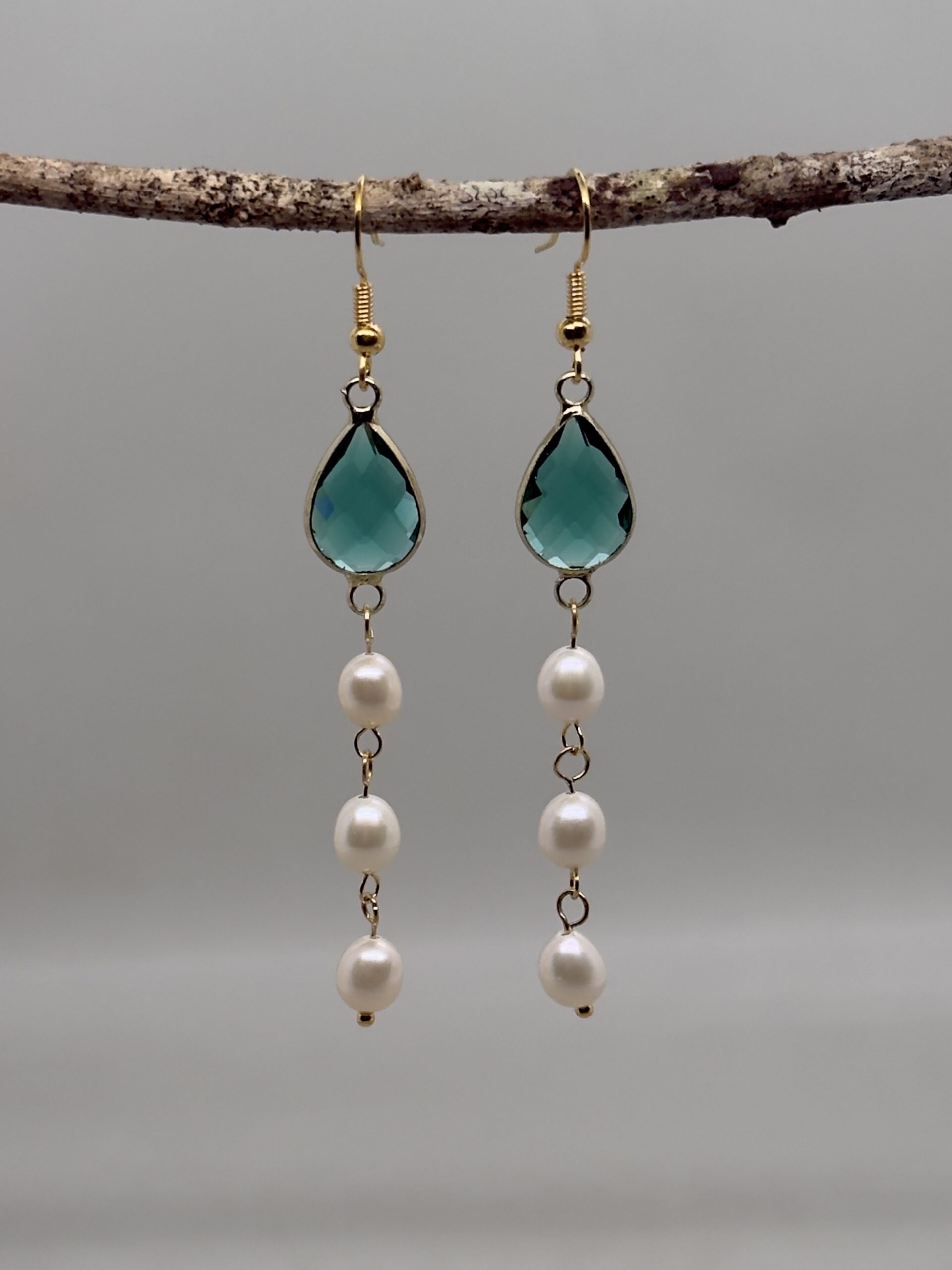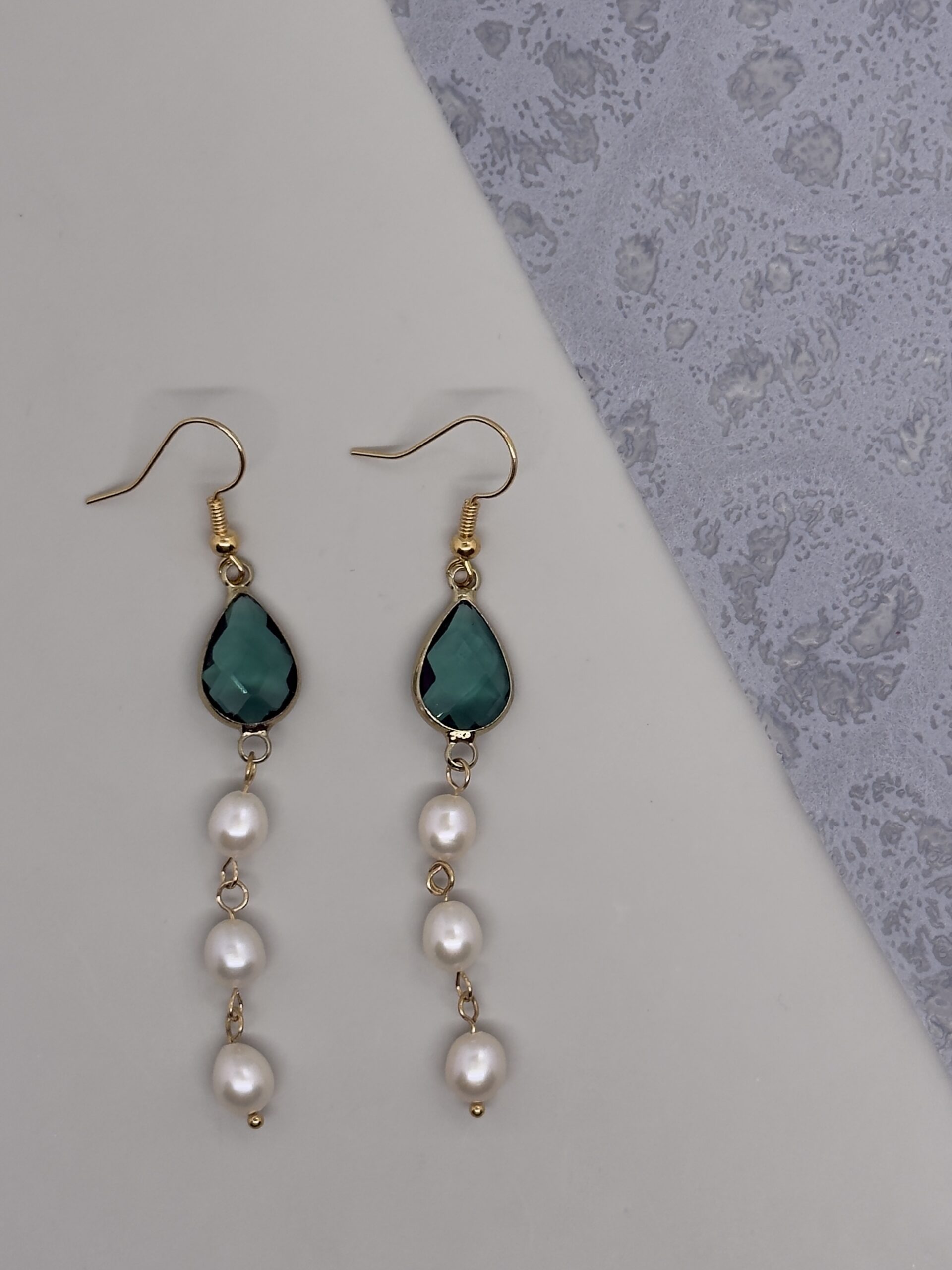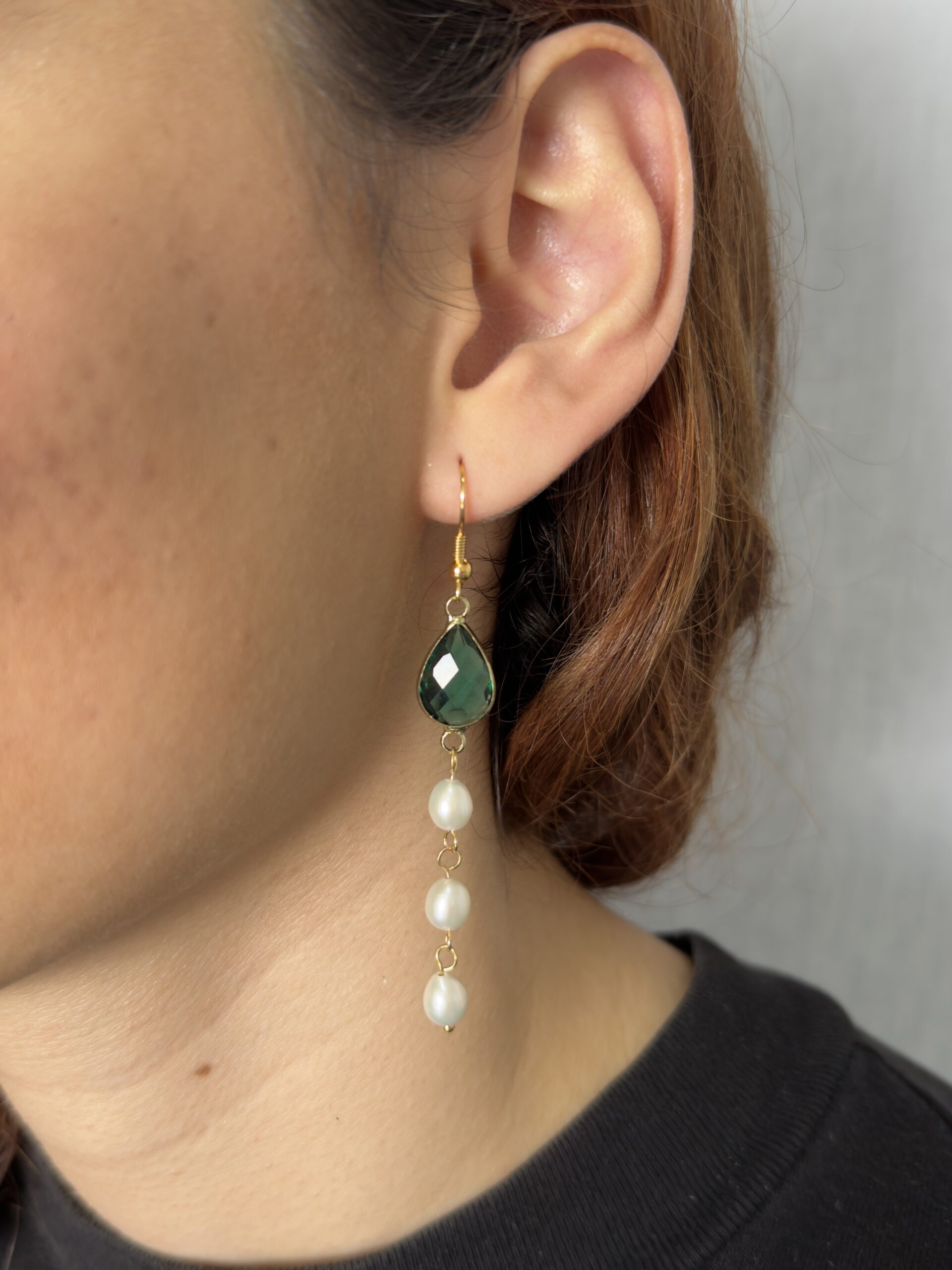 Aretes de gancho dorados con cristal verde y perlas que fusionan frescura y elegancia atemporal, un diseño que aporta color a tu look