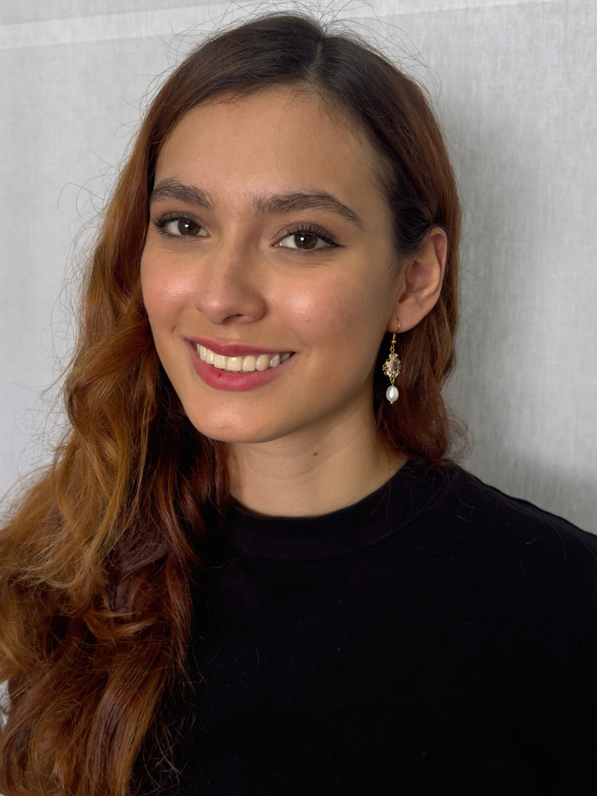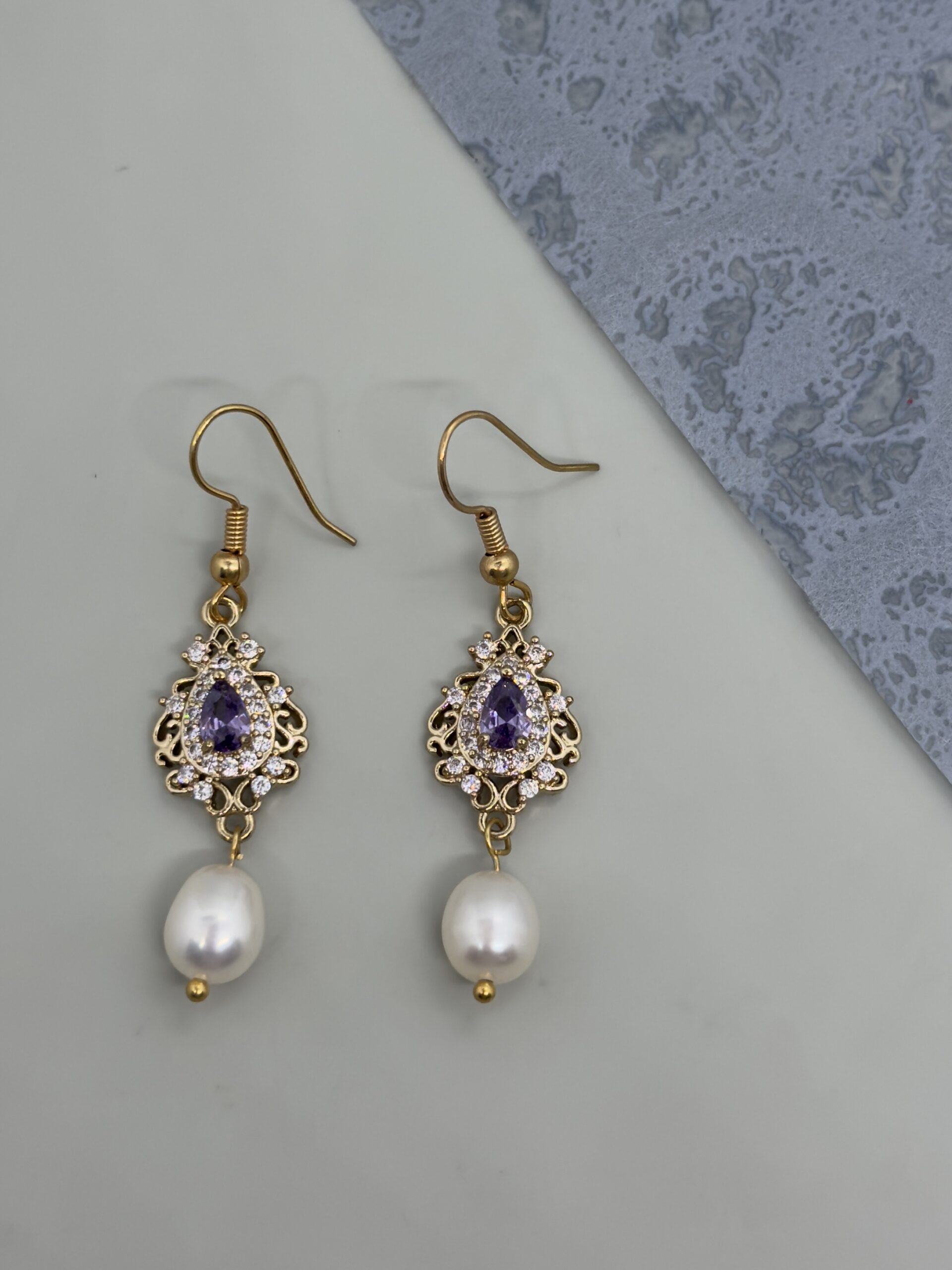 Una pieza vintage, con un toque lila que acentúan un estilo propio, este arete con perla oval colgando de 7x10mm es una verdadera elegancia