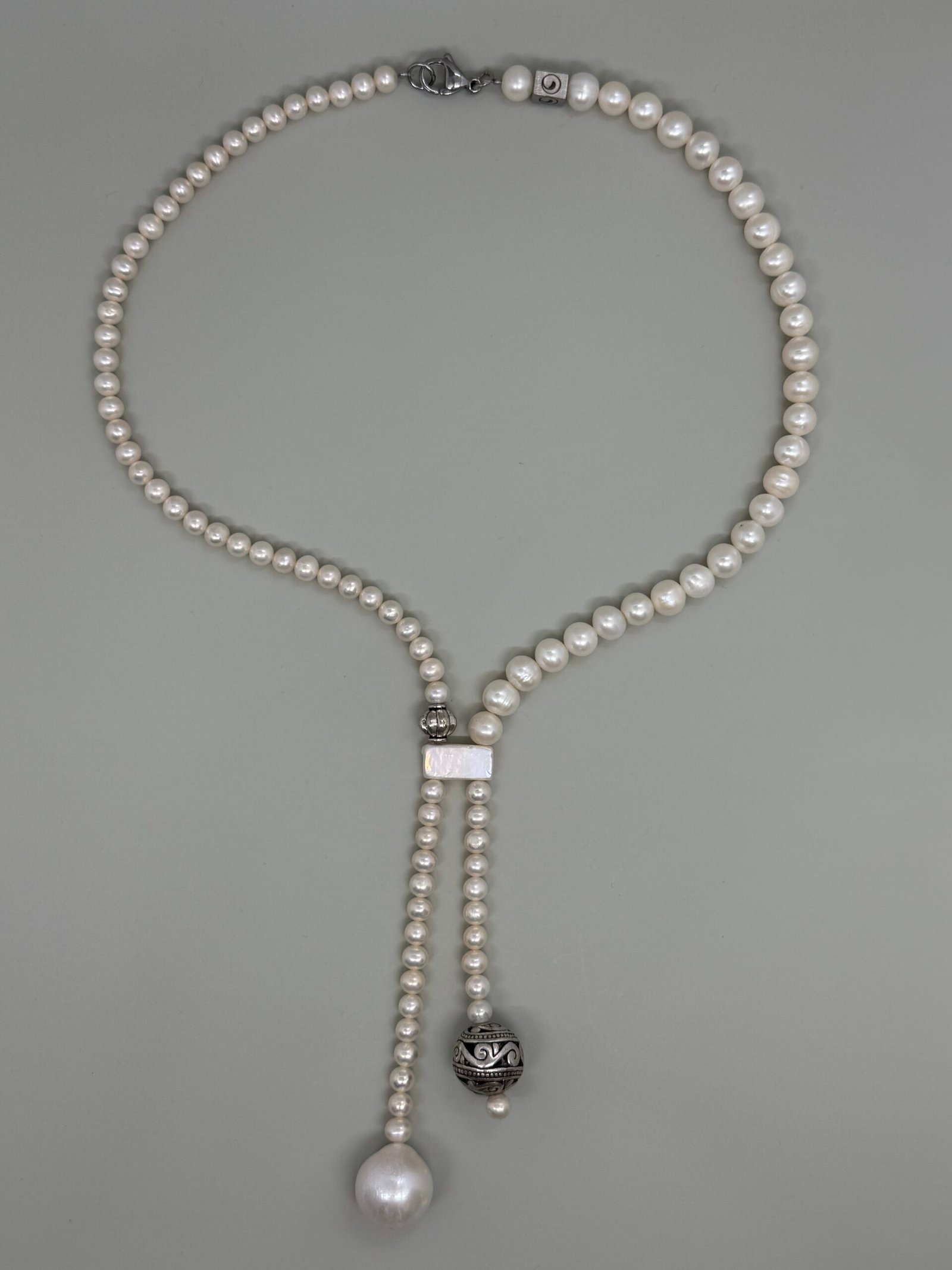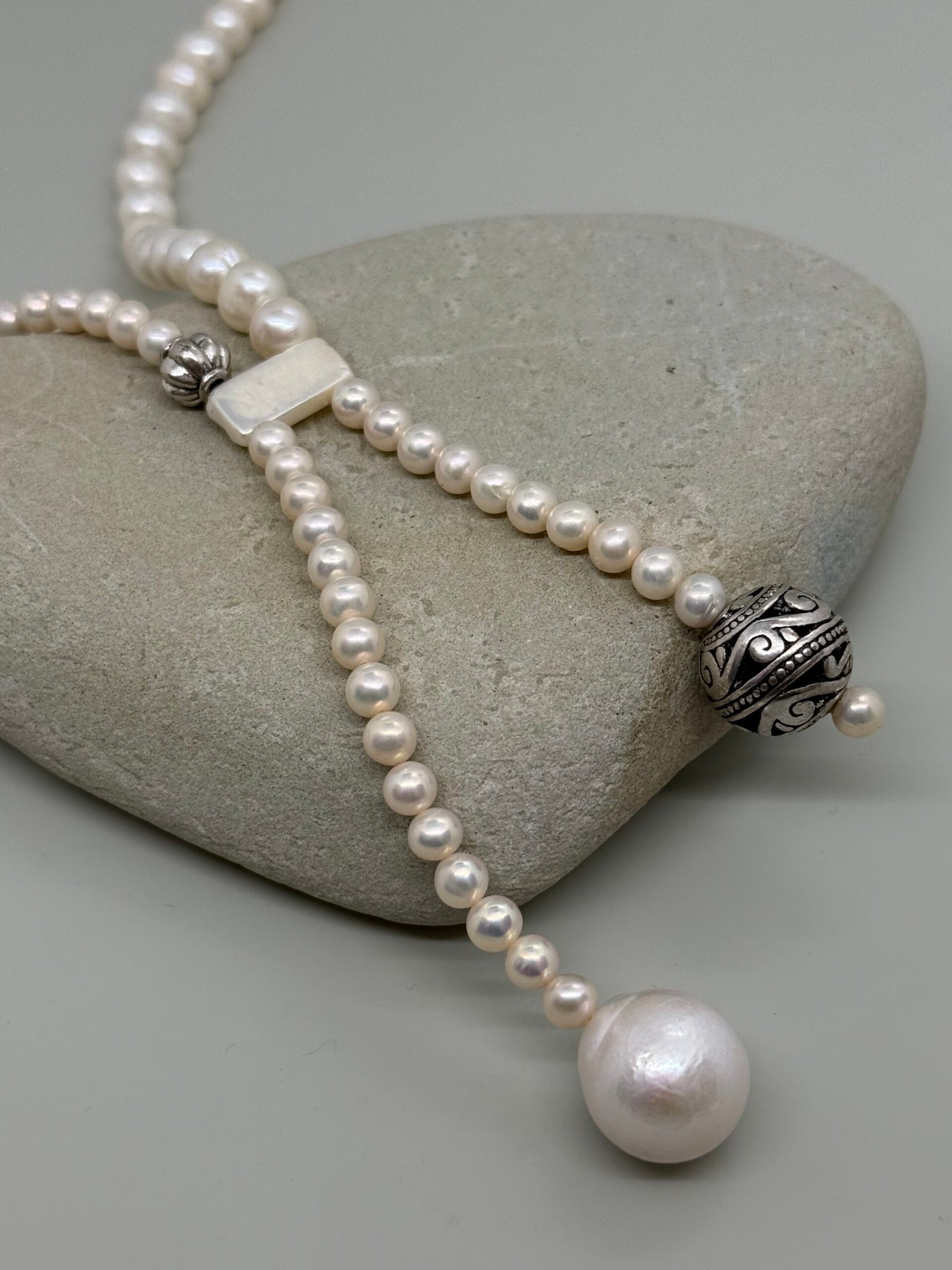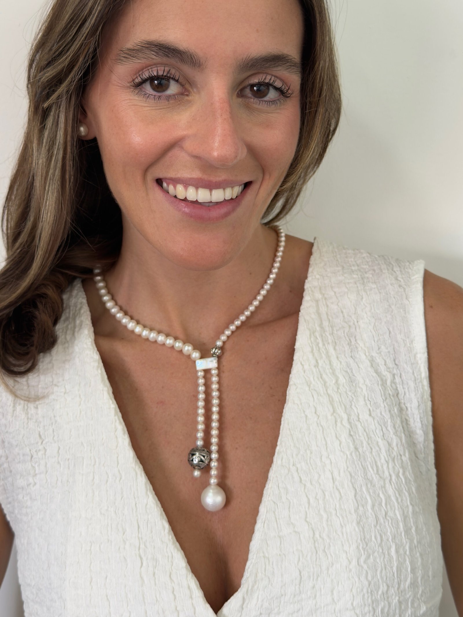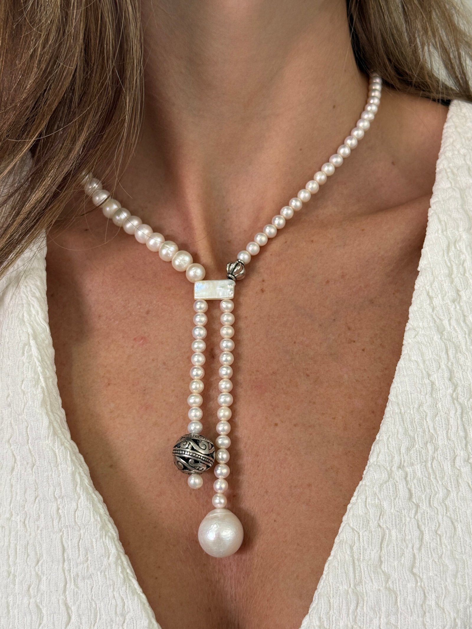 Collar elaborado con perlas cultivadas seleccionadas una a una, destacando por su brillo natural y armonía en cada detalle. Su diseño incorpora detalles en plateado que elevan la pieza convirtiendola en un accesorio elegante, versatil y atemporal