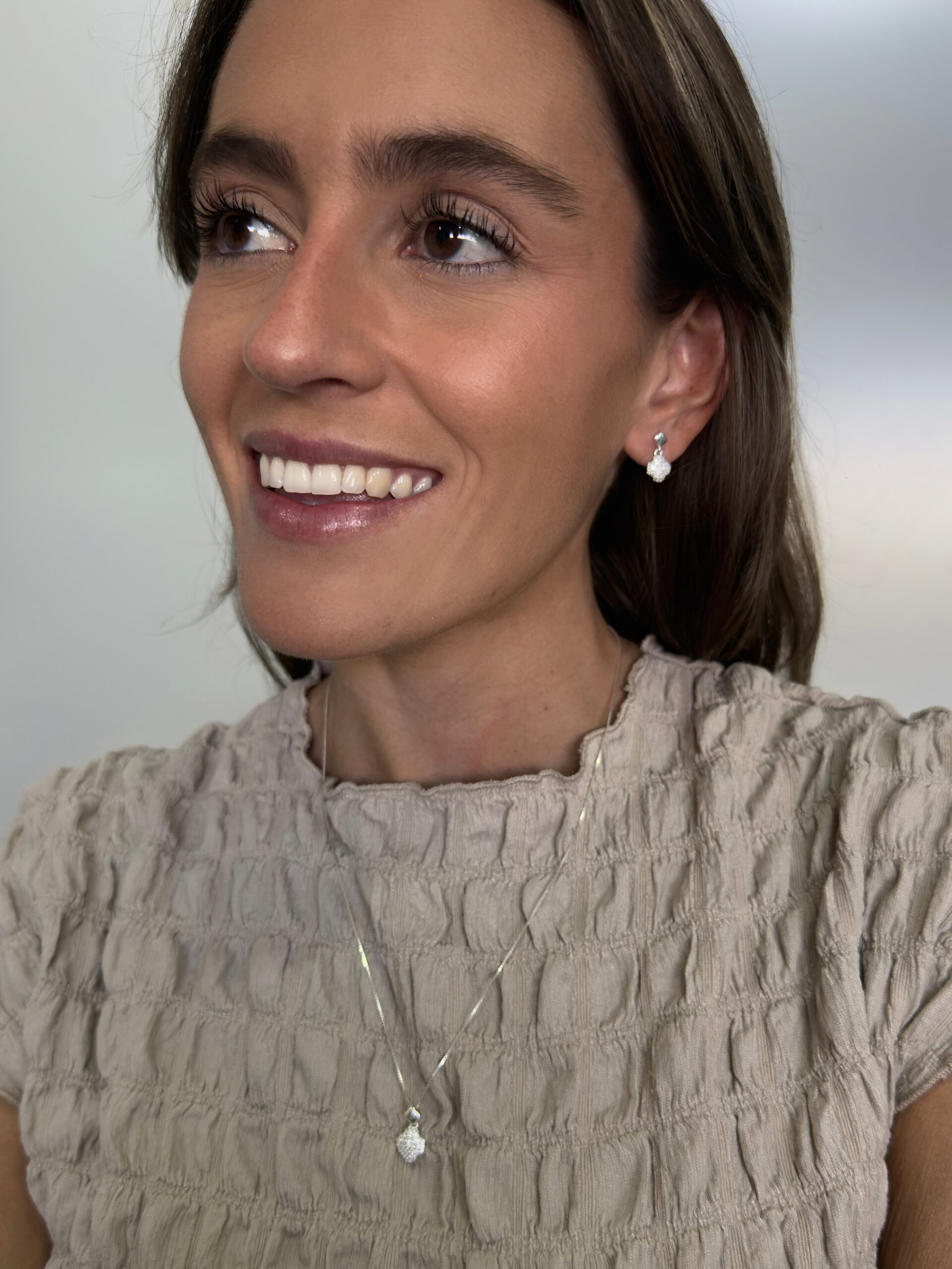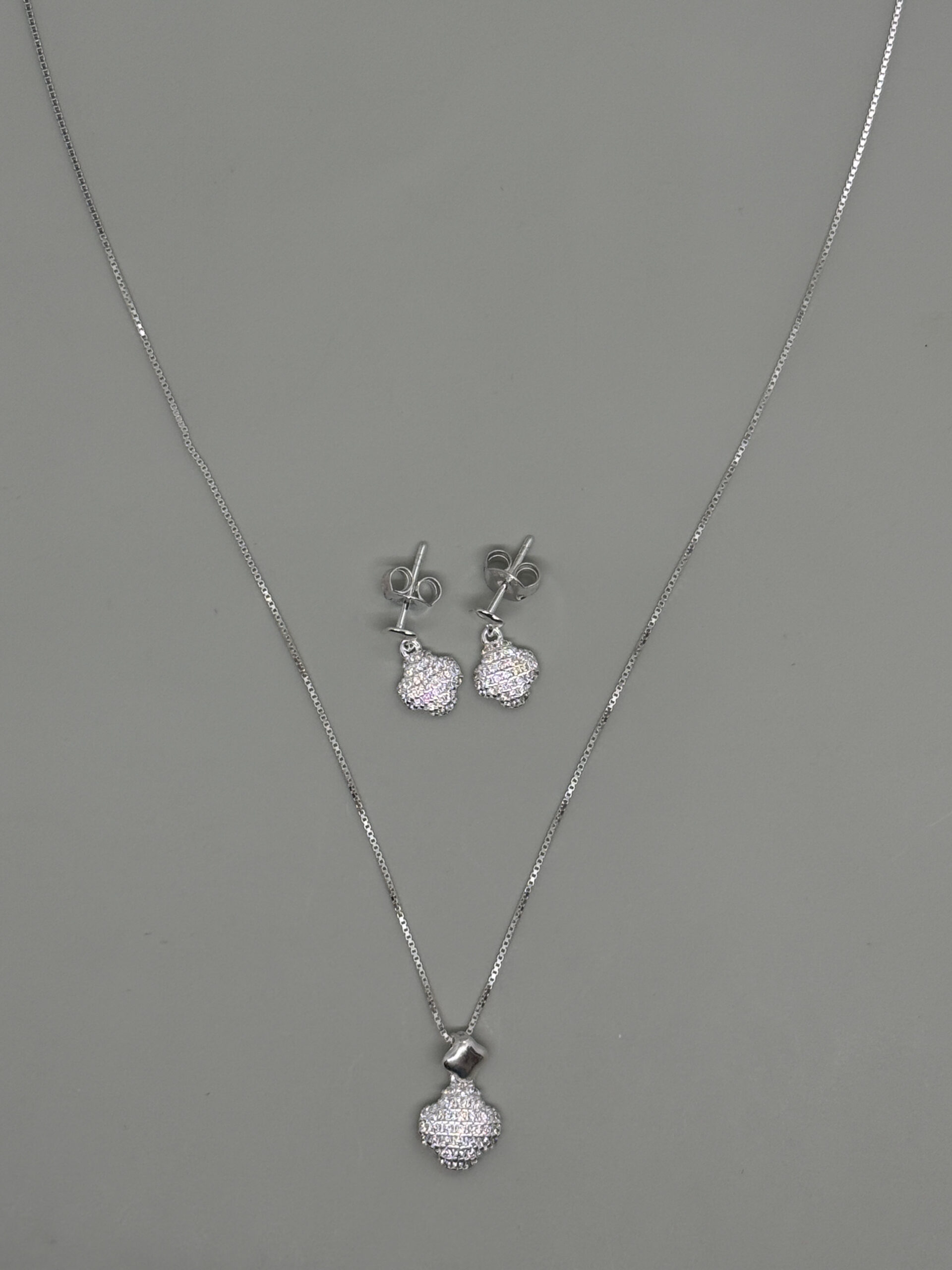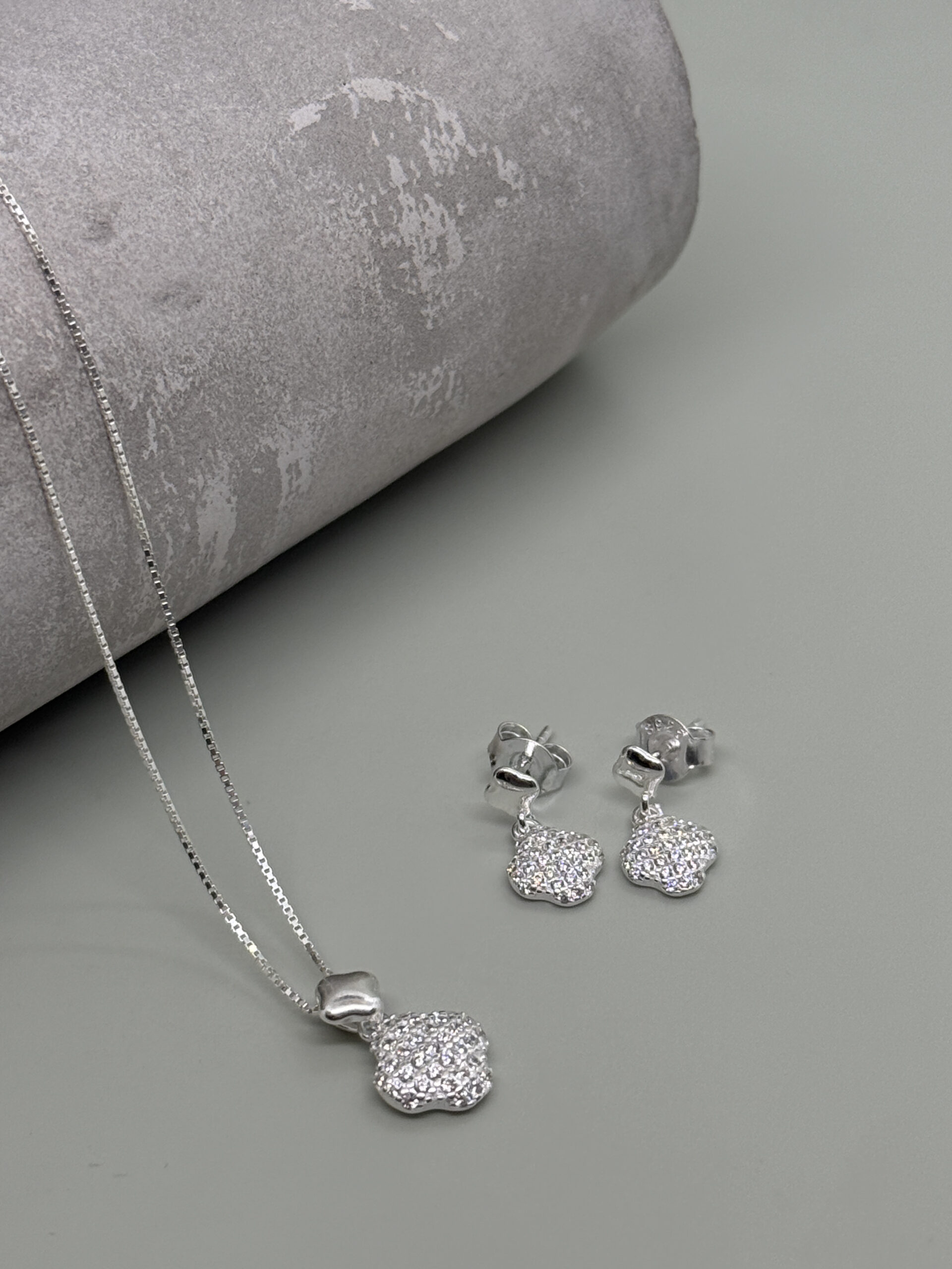 Set de joyería en plata 9.25, compuesto por cadena con dije y aretes coordinados. Su diseño atemporal lo convierte en un básico imprescindible, fácil de combinar y perfecto para regalar en momentos especiales.