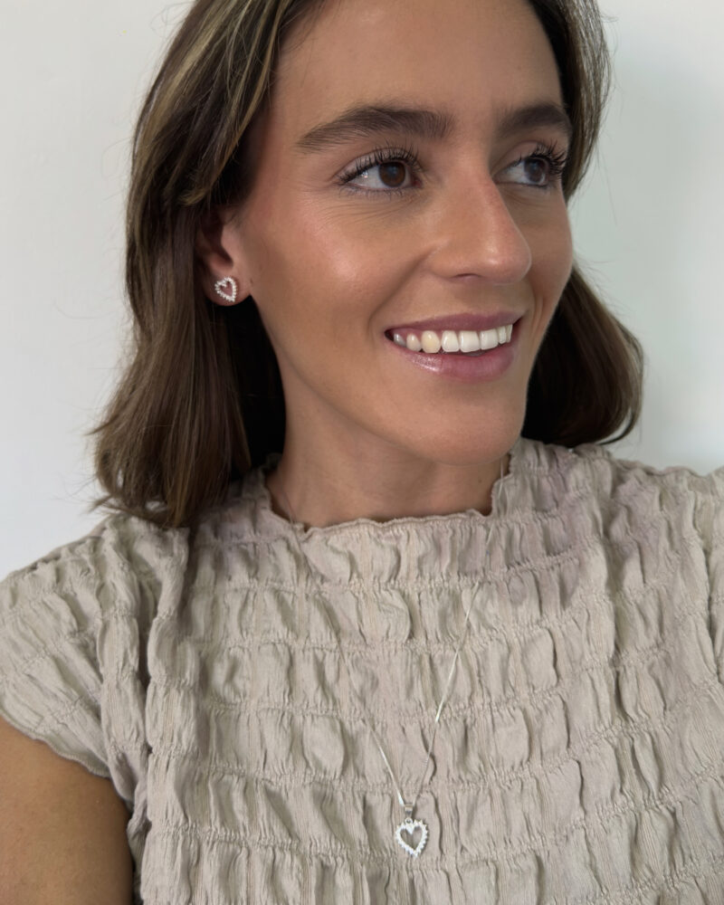 Este set de plata con cadena, dije corazón y aretes es perfecto para realzar tu estilo de forma sutil. Elaborado en plata de alta calidad, ofrece durabilidad y comodidad. Un conjunto ideal para lucir en cualquier ocasión, de día o de noche.