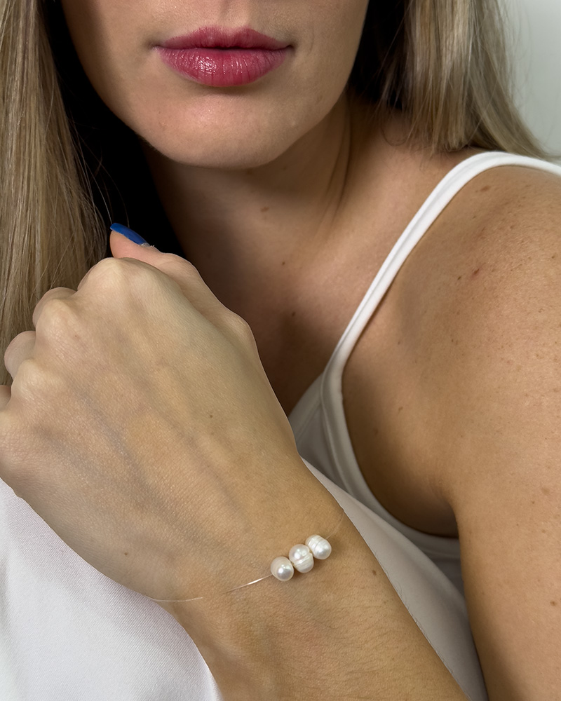 Pulsera delicada con tres perlas cultivada de 6mm un conjunto que emociona. Diseño elegante, con sutileza y belleza que brinda en cada actividad en que usted lo luzca. Perfecta para utilizar sola.