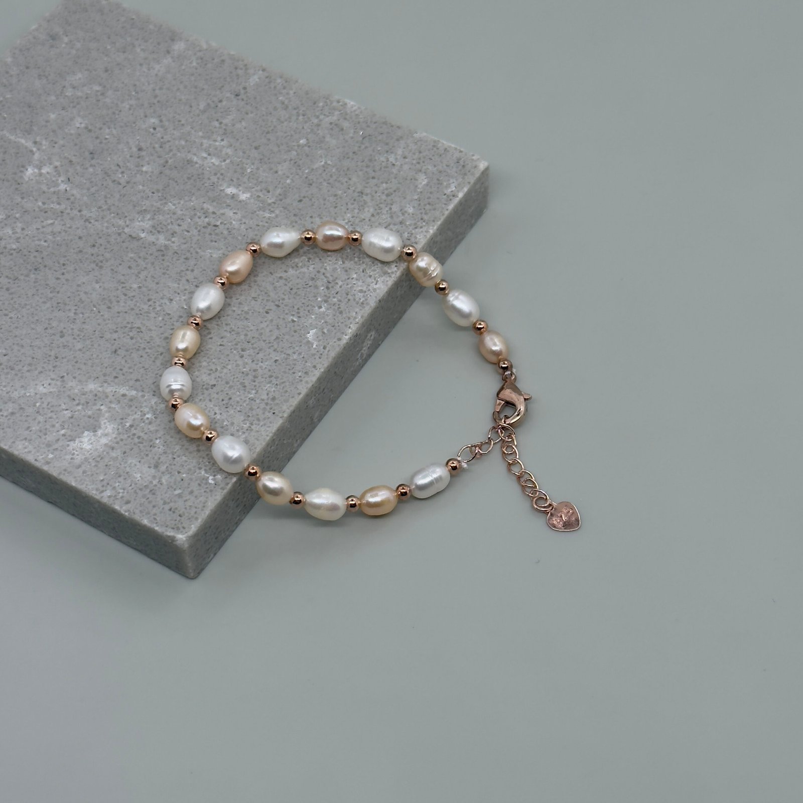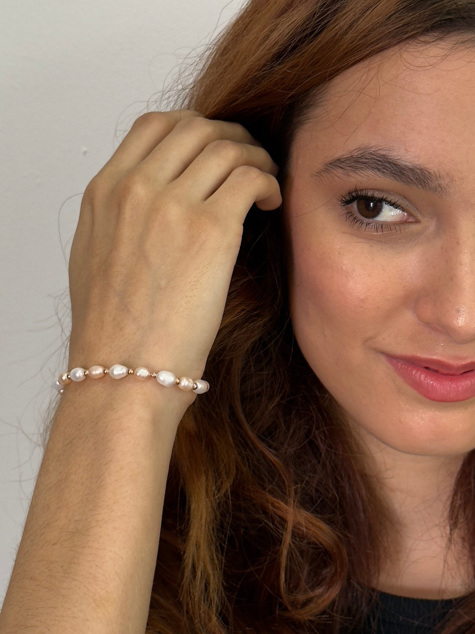 Esta pulsera de perlas cultivadas con separadores oro rosa, que su material es una aleación de rodio y aluminio, es perfecta para elevar tu outfit, un accesorio moderno que equilibra delicadeza y fuera femenina.