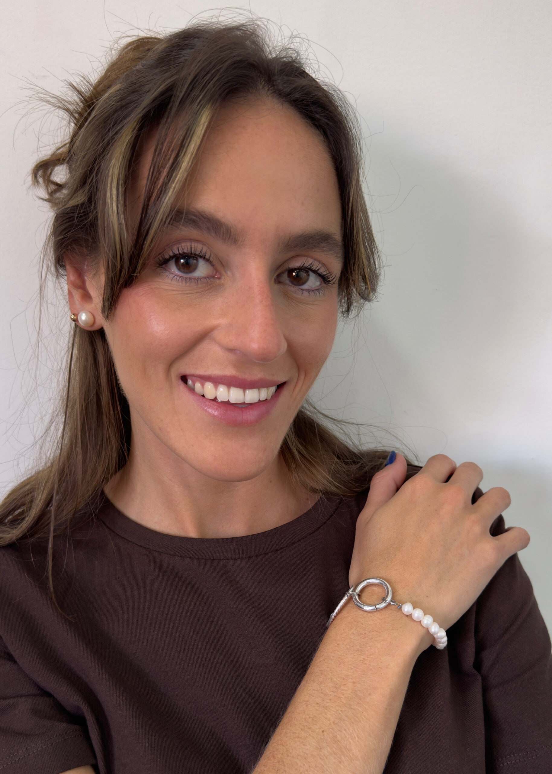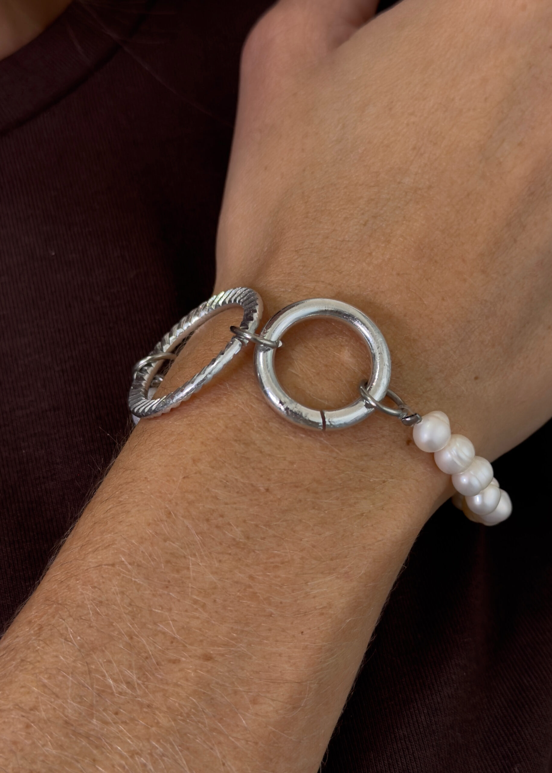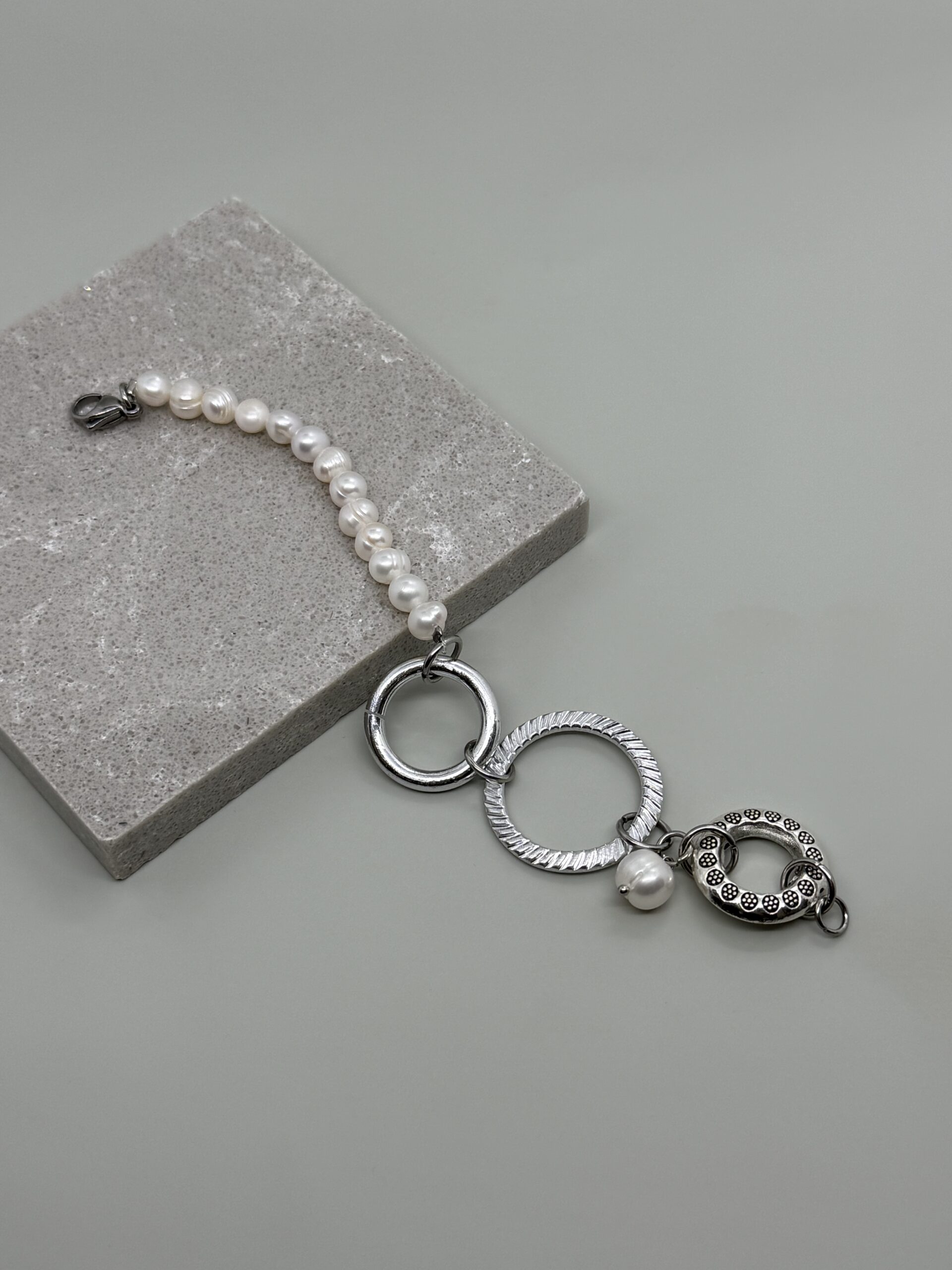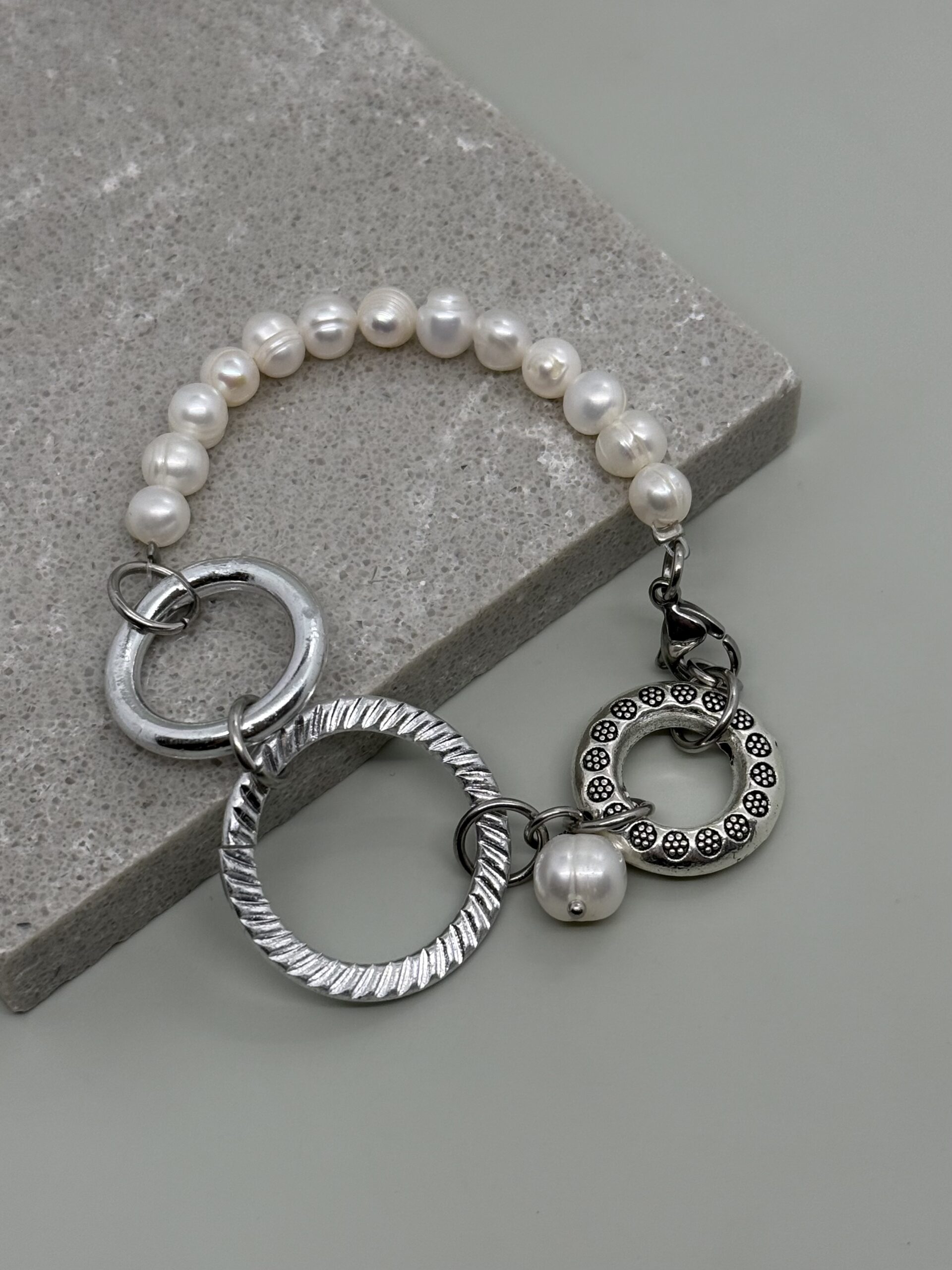 Pulsera con perlas cultivadas y argollas de acero plateadas