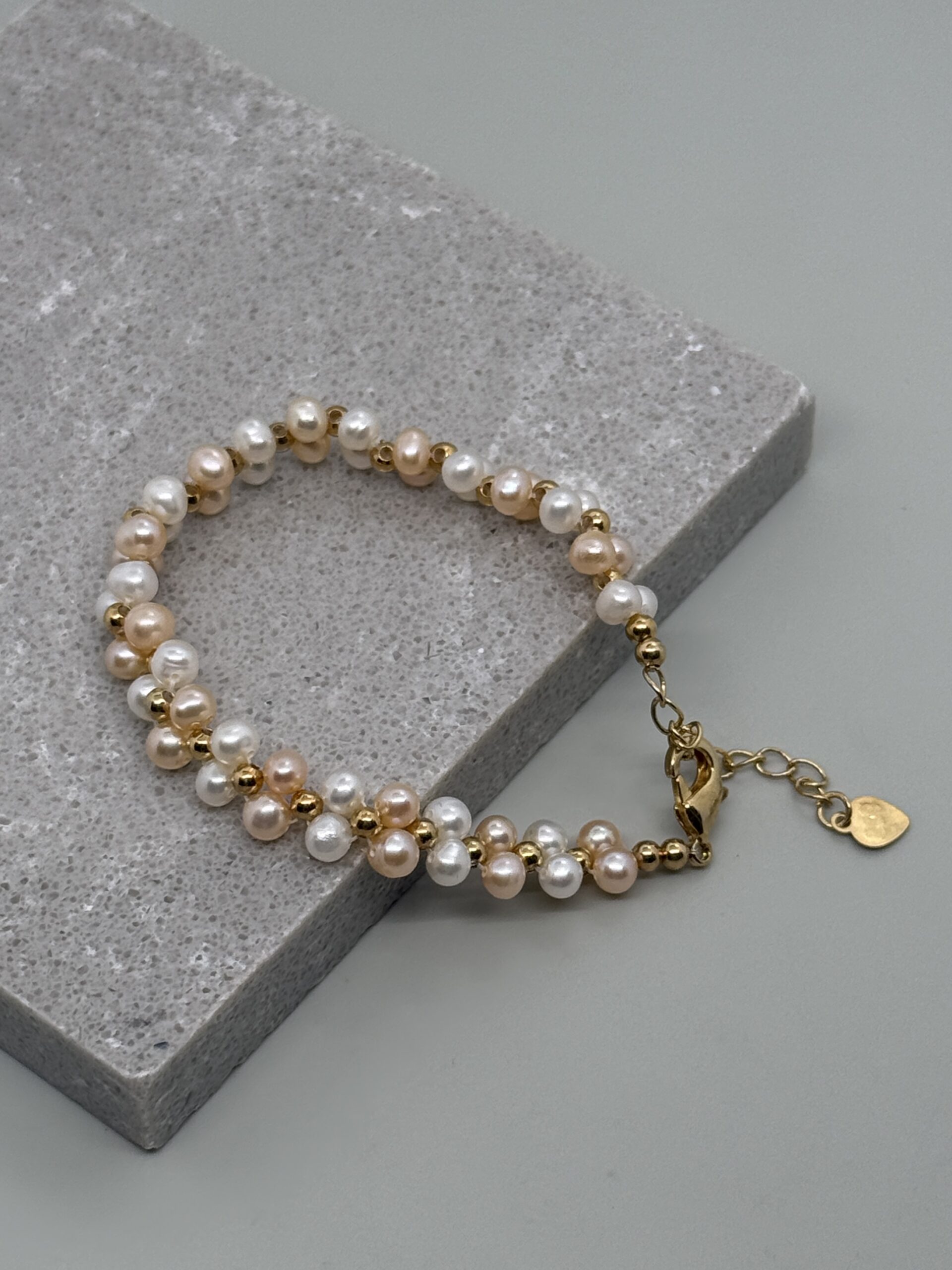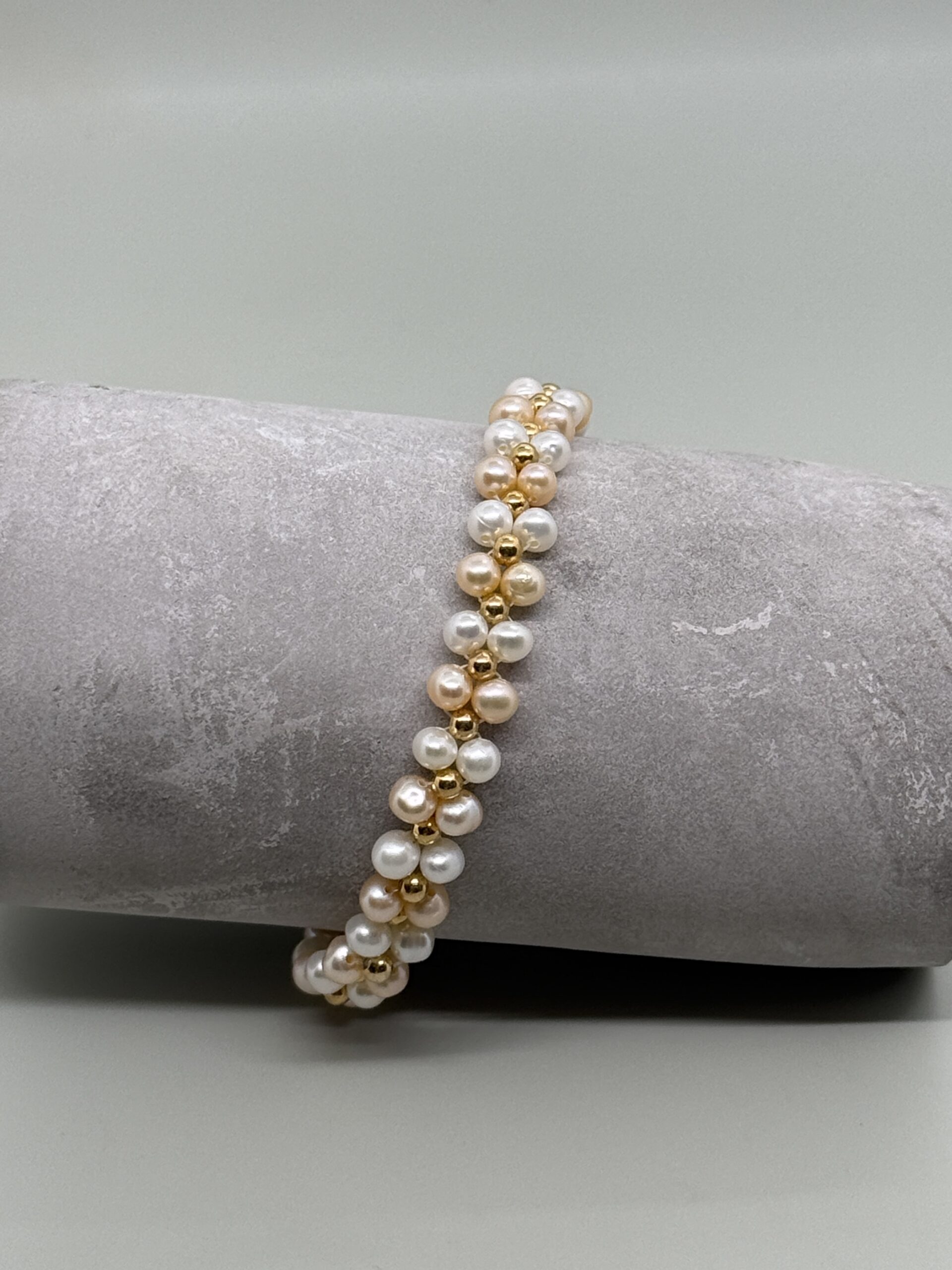 Esta pulsera con perlas de 4mm en blanco y peach es un »soft luxury» para cualquier outfit. Por su diseño tejido eleva tu elegante estilo cuando la uses.